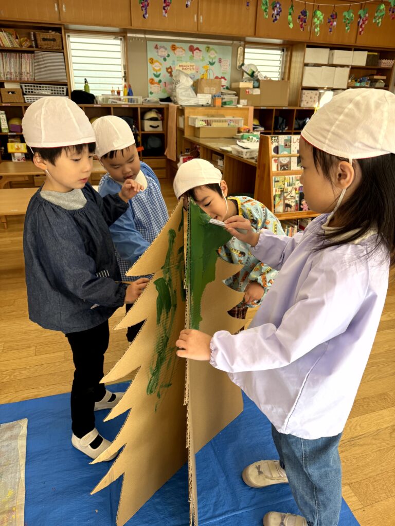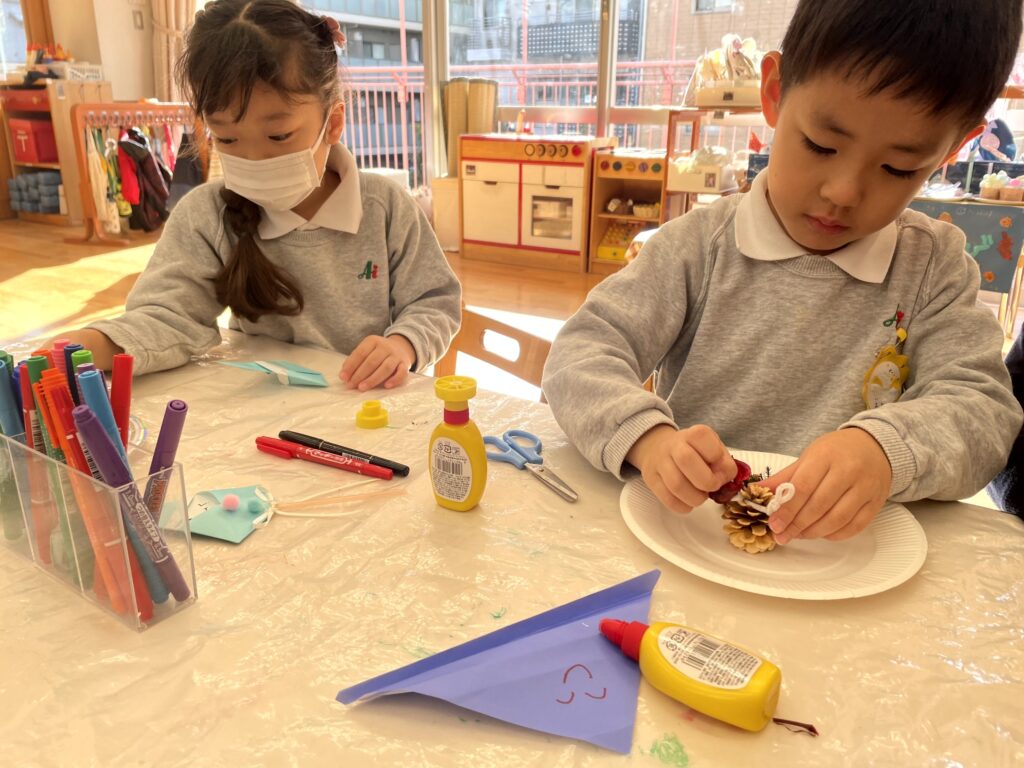 お店屋さんの品物作り。丁寧に折り紙を折ったり、松ぼっくりのオーナメントを作ります。