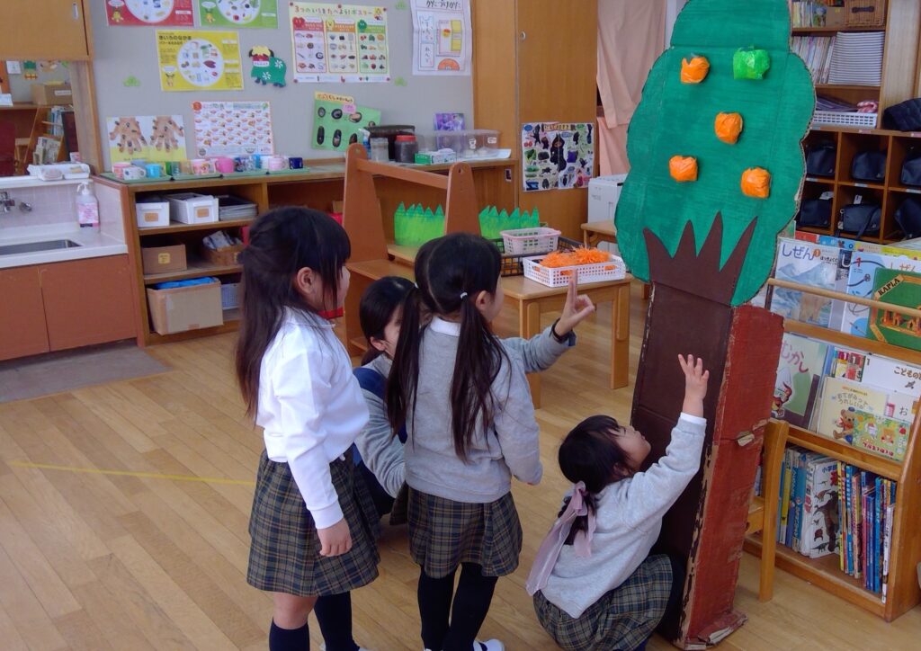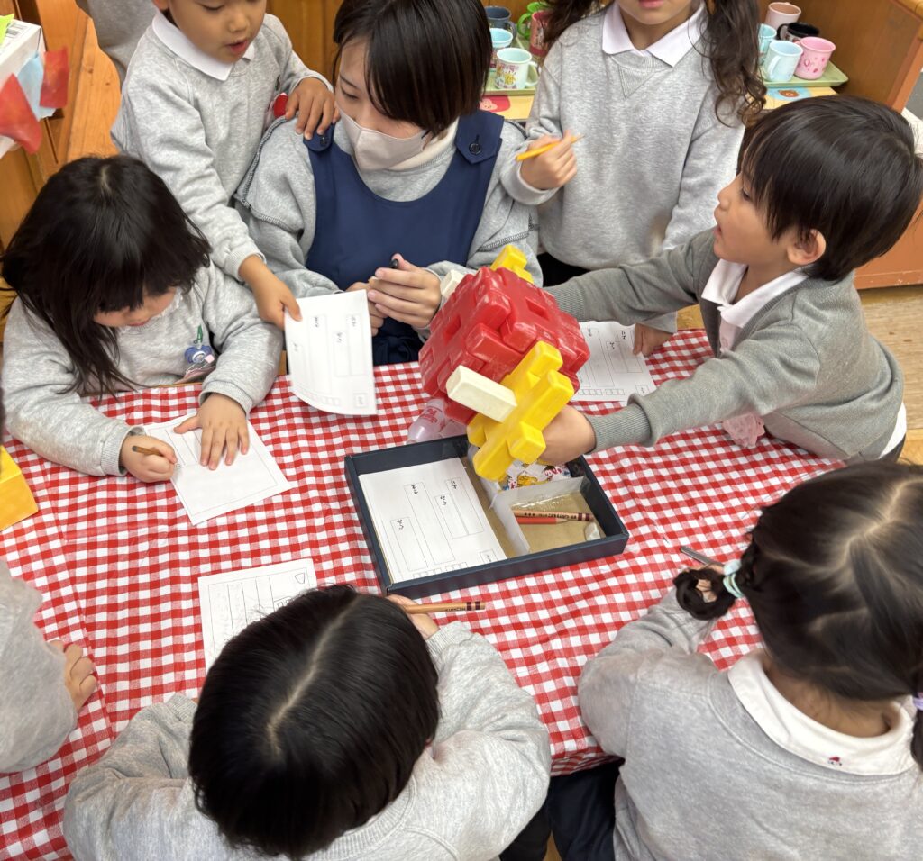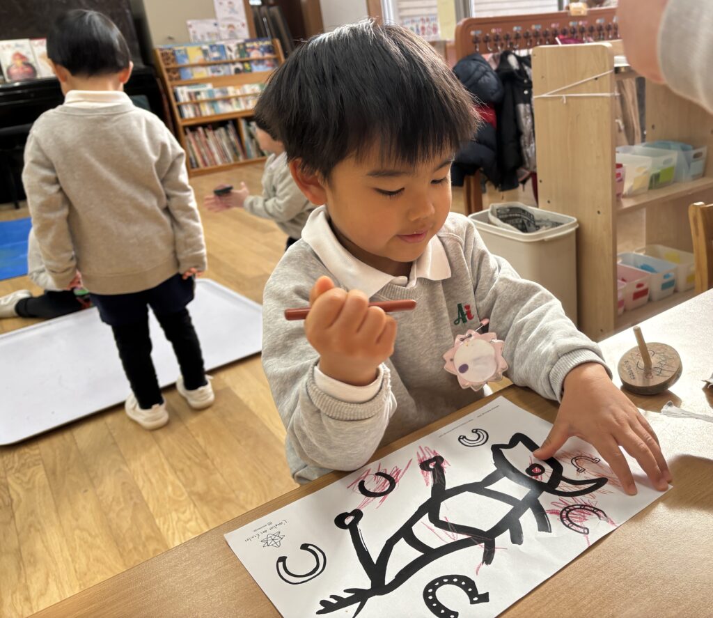 好きな遊びの時間に、コマ回しをしたり、象形文字のデザインの塗り絵をしたり・・・年少児のコマは手回しゴマ、3学期中はずっとコマ回し大会が開かれます。