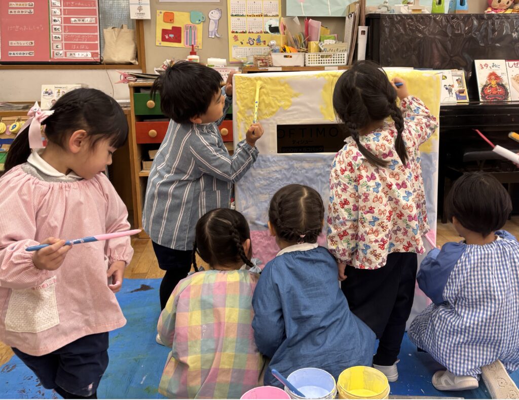 年少児は、2月の発表会の劇で使う大道具の‘自動販売機’を自分達で作りました。「絵の具ぬるの楽しい!」