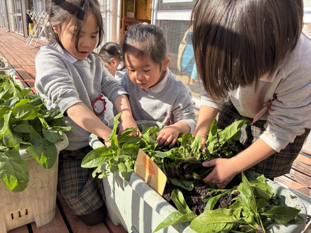 年中児は秋蒔きのほうれん草を、収穫してお味噌汁を作りました「お代わりください!」「とってもおいしい!」と大人気でした。