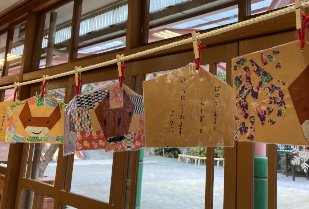 年少児が絵馬をつくりました。‘家族みんなが幸せでいられますように’という願い事が多く、心が温かくなりました。