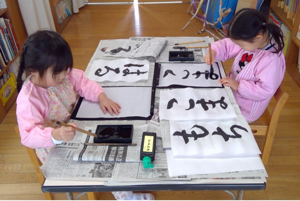 年長児と年中児は書初めを経験しました。「静かに気持ちを落ち着けて書きましょう」